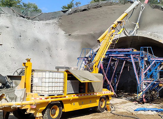 混凝土濕噴機(jī)的工作原理是將水泥、水和骨料按設(shè)計(jì)比例拌和均勻,用濕噴機(jī)壓送到噴頭處,再在噴頭處添加液壓速凝劑并與壓縮空氣混合后噴射到受噴面上,形成混凝土支護(hù)層。